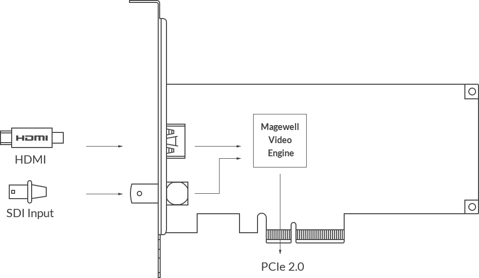 | Input Interface HDMI x1 SD/HD/3G/6G SDI x1 Support input resolution up to 4096×2160 pixels Host Interface PCIe Gen2 x4 | 10-bit video processing Deinterlace Cropping Color Adjustment Hardware Timestamp Color Space Conversion Up/down Conversion Aspect Ratio Conversion OSD SG-DMA Transmission mode | Auto Detection of Input Signal Format 3D HDMI Time Code Closed Caption HDR 10 | OS Windows, Linux, Mac Driver and Firmware Universal Driver, Updatable Firmware Included Software Capture Express Compatible Software 50+ |