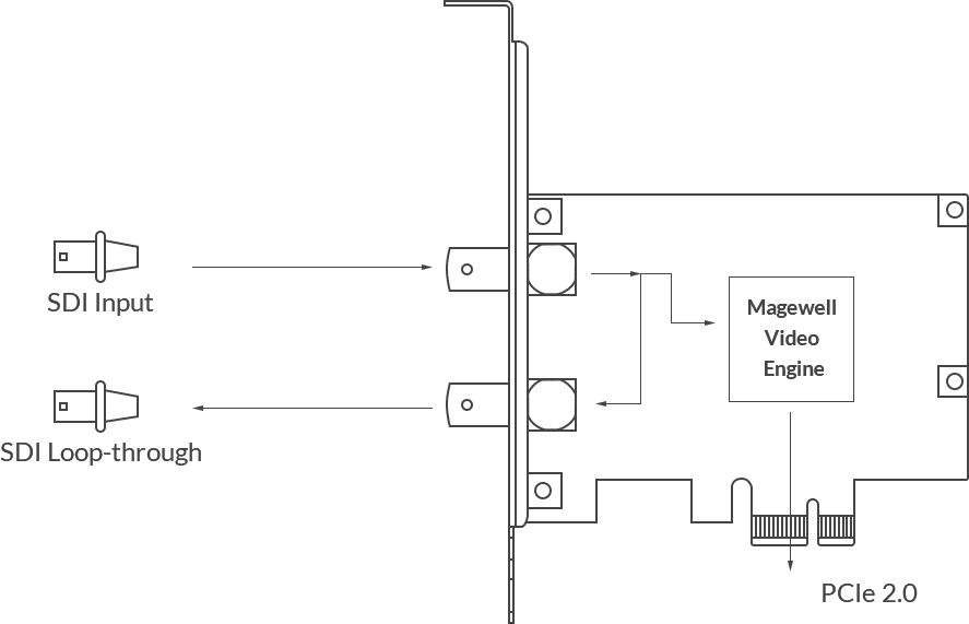 Magewell Pro Capture SDI card is a low-profile PCIe 2.0 x1 card.  Allowing for capturing one channel of SD/HD/3G-SDI input via a BNC connector. Also offering a loopback output on a BNC connector. The card supports numerous SDI formats and color sampling modes, a 2K mode (2048×1080), 10- and 12-bit color depths. Up to 8 audio channels at 48 kHz. Output resolutions up to 2048×2048. Frame rates up to 120 fps. Pro Capture SDI is also capable of numerous video processing features. Includes cropping, scaling, de-interleaving, aspect ratio conversion, color format conversion, video frame rate conversion, and video OSD composition